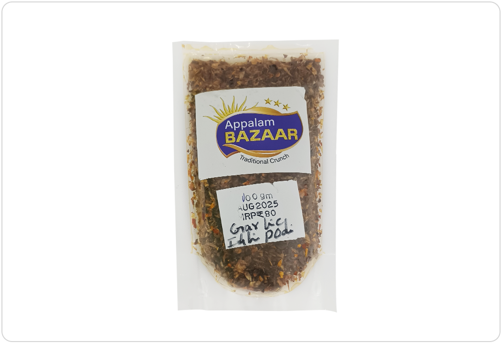INGREDIENTS:Garlic, Bengal Gram Dal, Urad Dal, Pepper, Cumin, Asafoetida, Red Chilli & Salt