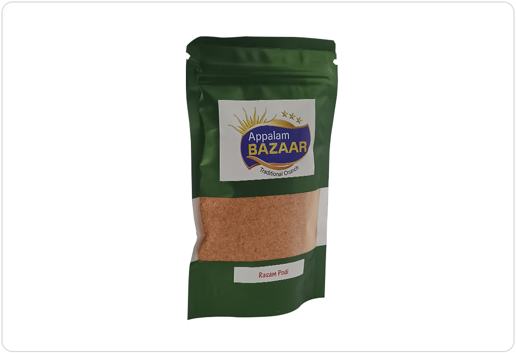 Appalam Bazaar Rasam Podi. contains various spices which are included in the recipe, and is also known for its simple, yet rich taste. For the most authentic, tangy and tasty South Indian Rasam use Appalam Bazaar Rasam Podi.